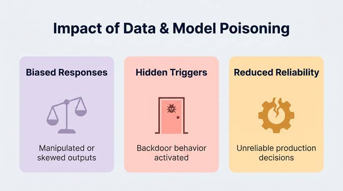 Poisoning happens when attackers manipulate training, fine-tuning, or knowledge sources to alter model behavior.
